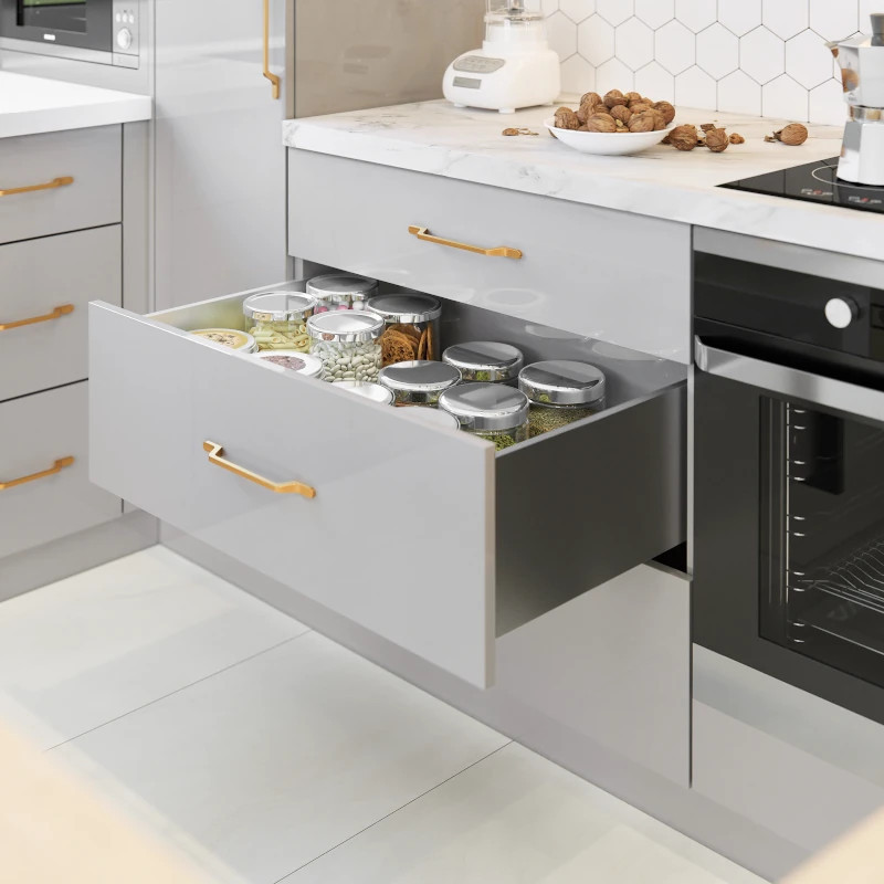 - W zestawie: boki szuflady, mocowanie frontu, mocowanie ścianki tylnej, prowadnice, zaślepki