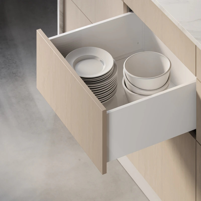 Szuflada AXIS PRO to synonim trwałości i niezawodności. Jej wytrzymałość została certyfikowana na aż 60 000 cykli, co gwarantuje długie i bezproblemowe użytkowanie. System oferuje pełny wysuw w długościach od 300 do 550 mm, zapewniając wygodny dostęp do całej zawartości szuflady. Zintegrowany mechanizm push to open umożliwia płynne otwieranie poprzez naciśnięcie w dowolnym miejscu frontu. Nowoczesny design z wąskim bokiem o szerokości zaledwie 14 mm pozwala maksymalnie wykorzystać przestrzeń wewnętrzną mebla, zwiększając jego funkcjonalność bez kompromisów estetycznych. Szuflada wytrzymuje obciążenie do 40 kg, dzięki czemu doskonale sprawdzi się również przy przechowywaniu cięższych przedmiotów. System GTV AXIS PRO umożliwia regulację w trzech płaszczyznach: poziomej, pionowej oraz nachylenia frontu, co pozwala na precyzyjne dopasowanie po montażu. W przypadku gdy szerokość szuflady jest większa niż długość nominalna prowadnicy, zalecamy zastosowanie poprzeczki synchronizującej (sprzedawanej osobno).