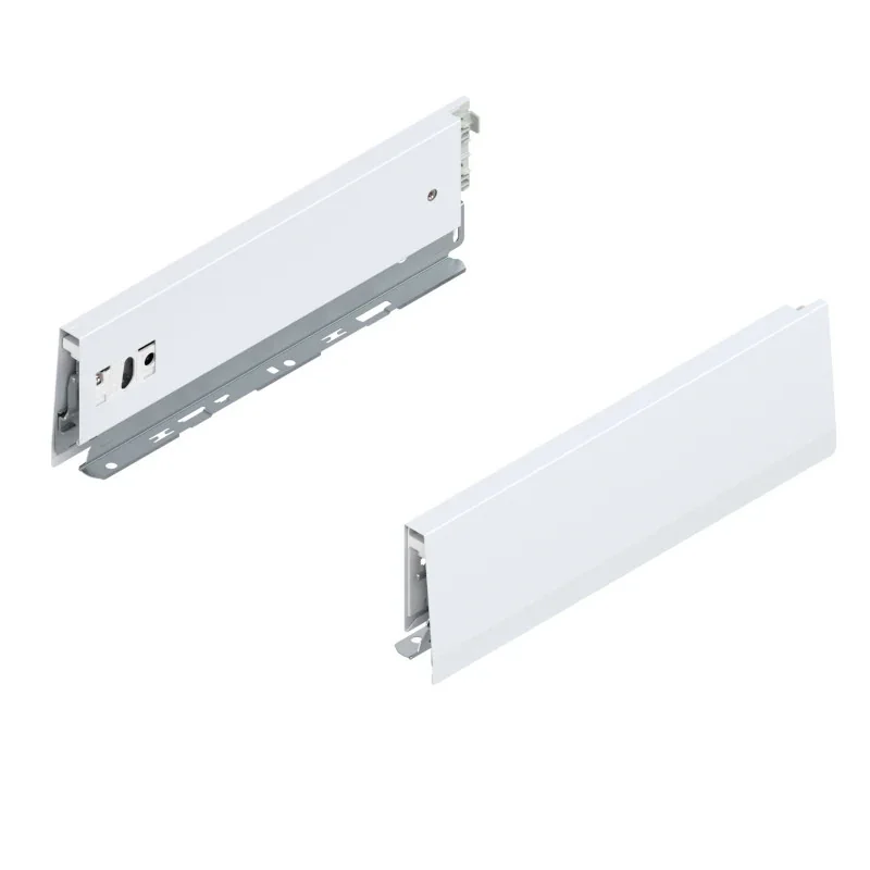 Boki przeznaczone są do montażu w systemie szuflad BLUM MARIVOBOX. Kompatybilne zarówno z szufladami standardowymi, jak i wewnętrznymi, w wariantach wysokości M i E. Cienkościenne boki metalowe wykonano w kolorze białym, a ich prosta forma od wewnątrz pozwala maksymalnie wykorzystać przestrzeń do przechowywania.