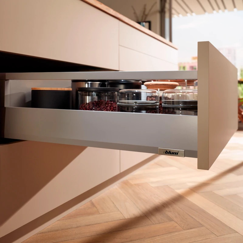 Reling podłużny Blum został zaprojektowany do zastosowania w szufladach MERIVOBOX o głębokości 500 mm. Pełni funkcję wzmacniającą w szufladach z wysokim frontem, jednocześnie zwiększając ich stabilność i możliwości praktycznego zagospodarowania wnętrza. Reling montuje się wzdłuż boku szuflady, a do jego montażu mocowania należy dokupić oddzielnie.