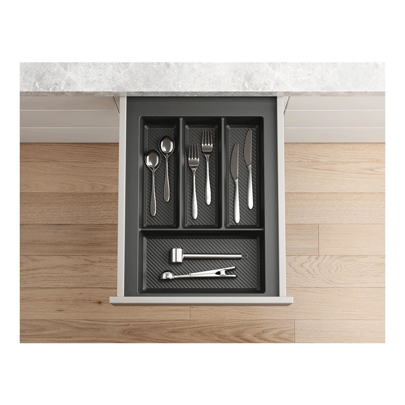 Organizery MAX to nowoczesne i praktyczne rozwiązania do każdej kuchni. Wykonane zostały z wysokiej jakości tworzywa o grubości 2 mm, metodą formy wtryskowej. Dzięki specjalnej, ryflowanej strukturze dna cechują się wyjątkową trwałością, zapobiegają przesuwaniu się przedmiotów w trakcie otwierania szuflady oraz ułatwiają utrzymanie czystości. Krawędzie wkładów można przycinać we własnym zakresie, zarówno na szerokość jak i głębokość, co pozwala dostosować produkt do niestandardowych wymiarów szuflad. Przegrody o różnych wymiarach idealnie dopasowane są do różnych rodzajów sztućców, zapewniając wygodę i porządek w organizacji. Pasują do szuflad na prowadnicach o głębokości 450 i 500 mm.