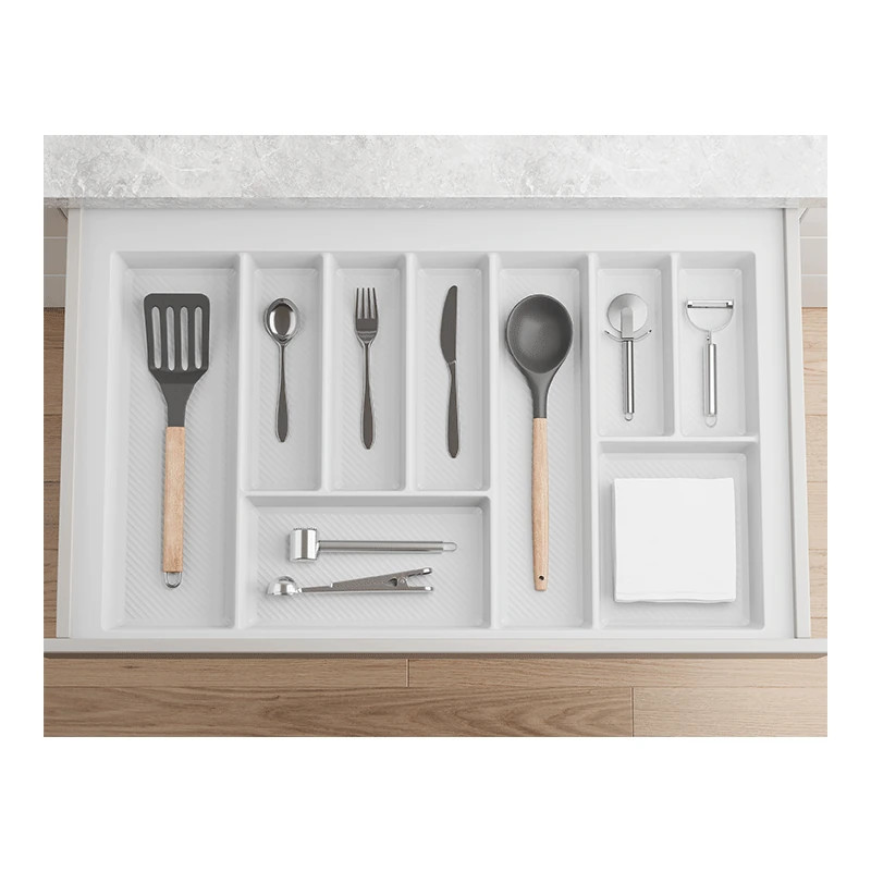 Organizery MAX to nowoczesne i praktyczne rozwiązania do każdej kuchni. Wykonane zostały z wysokiej jakości tworzywa o grubości 2 mm, metodą formy wtryskowej. Dzięki specjalnej, ryflowanej strukturze dna cechują się wyjątkową trwałością, zapobiegają przesuwaniu się przedmiotów w trakcie otwierania szuflady oraz ułatwiają utrzymanie czystości. Krawędzie wkładów można przycinać we własnym zakresie, zarówno na szerokość jak i głębokość, co pozwala dostosować produkt do niestandardowych wymiarów szuflad. Przegrody o różnych wymiarach idealnie dopasowane są do różnych rodzajów sztućców, zapewniając wygodę i porządek w organizacji. Pasują do szuflad na prowadnicach o głębokości 450 i 500 mm.
