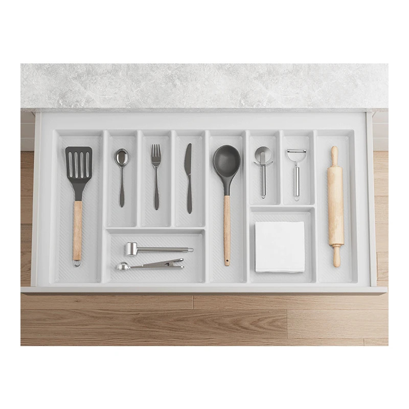 Organizery MAX to nowoczesne i praktyczne rozwiązania do każdej kuchni. Wykonane zostały z wysokiej jakości tworzywa o grubości 2 mm, metodą formy wtryskowej. Dzięki specjalnej, ryflowanej strukturze dna cechują się wyjątkową trwałością, zapobiegają przesuwaniu się przedmiotów w trakcie otwierania szuflady oraz ułatwiają utrzymanie czystości. Krawędzie wkładów można przycinać we własnym zakresie, zarówno na szerokość jak i głębokość, co pozwala dostosować produkt do niestandardowych wymiarów szuflad. Przegrody o różnych wymiarach idealnie dopasowane są do różnych rodzajów sztućców, zapewniając wygodę i porządek w organizacji. Pasują do szuflad na prowadnicach o głębokości 450 i 500 mm.