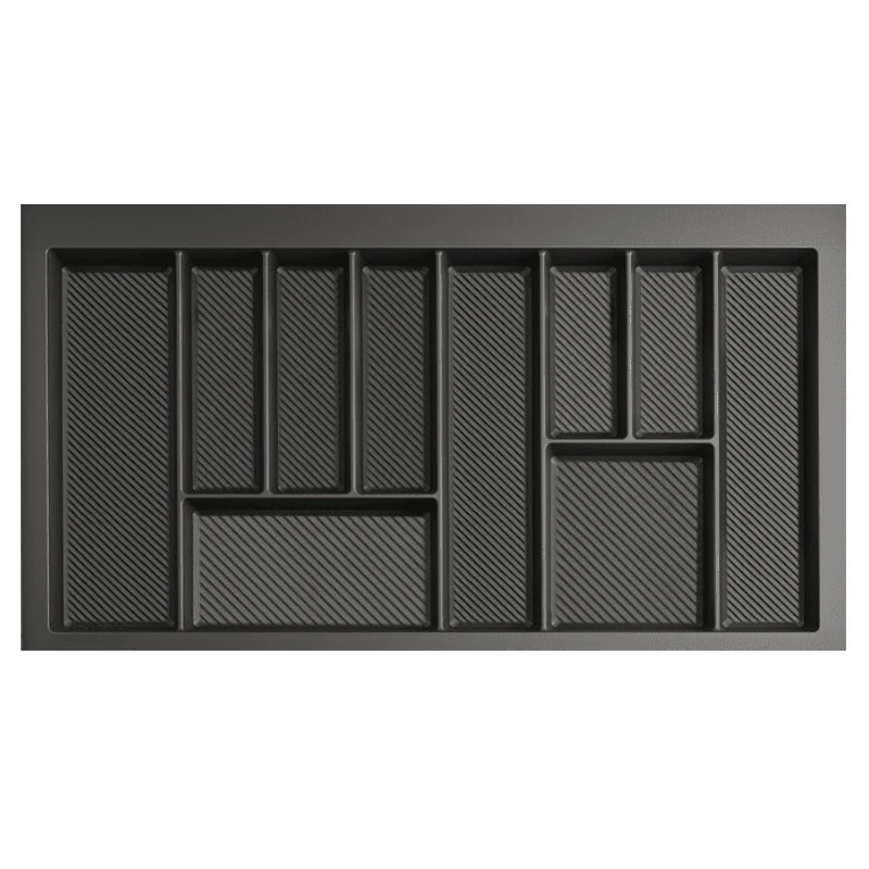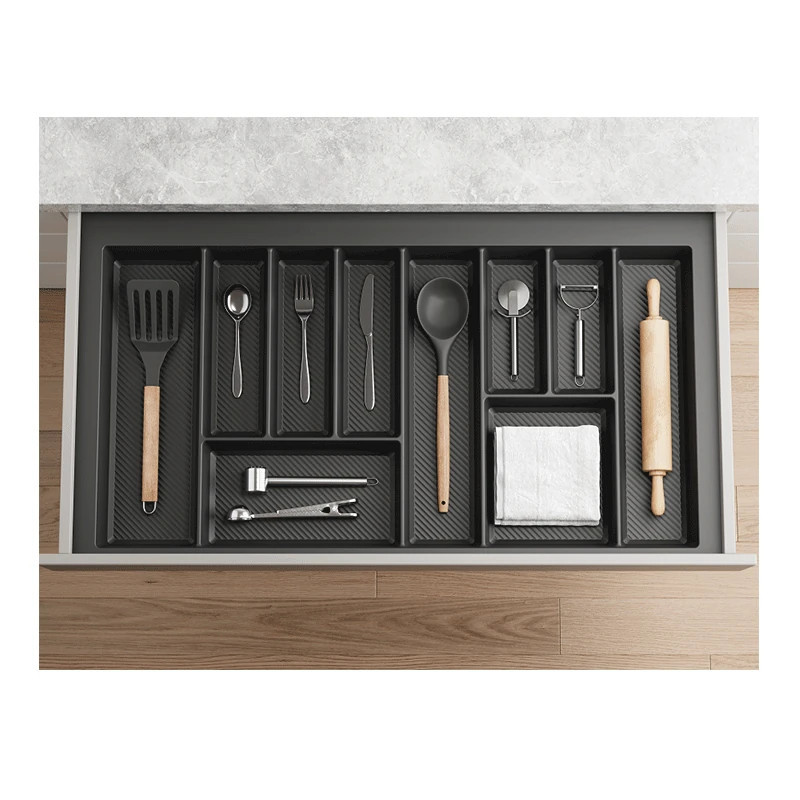 Organizery MAX to nowoczesne i praktyczne rozwiązania do każdej kuchni. Wykonane zostały z wysokiej jakości tworzywa o grubości 2 mm, metodą formy wtryskowej. Dzięki specjalnej, ryflowanej strukturze dna cechują się wyjątkową trwałością, zapobiegają przesuwaniu się przedmiotów w trakcie otwierania szuflady oraz ułatwiają utrzymanie czystości. Krawędzie wkładów można przycinać we własnym zakresie, zarówno na szerokość jak i głębokość, co pozwala dostosować produkt do niestandardowych wymiarów szuflad. Przegrody o różnych wymiarach idealnie dopasowane są do różnych rodzajów sztućców, zapewniając wygodę i porządek w organizacji. Pasują do szuflad na prowadnicach o głębokości 450 i 500 mm.