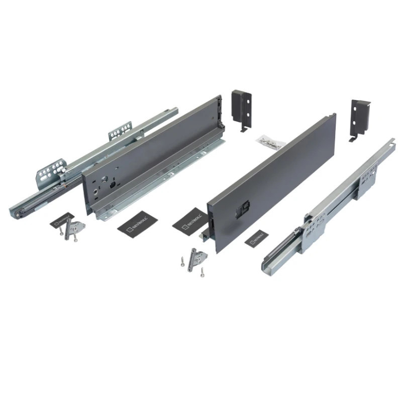 - W zestawie: boki szuflady, mocowanie frontu, mocowanie ścianki tylnej, prowadnice, zaślepki